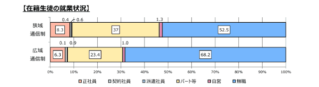 文部科学省のデータでも、通信制課程の年齢別生徒の就業状況を見ても正社員やパートなどの割合が約3~5割程度在籍していることから、多くの社会人が学んでいることがわかります。