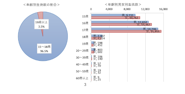 全国私立通信制高等学校協会のデータでも、通信制課程の年齢別生徒数については若年化が進んでいるものの20代以降の割合も一定数いることがわかります。
