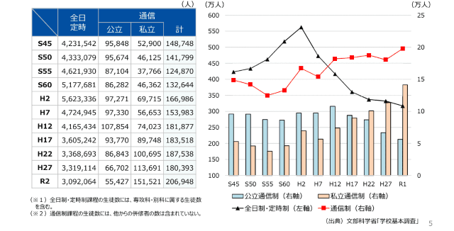 文部科学省のデータによると通信制課程の生徒数は全体として増加傾向にあることが示されています。