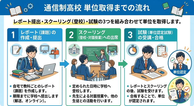 通信制高校では、決められた仕組みに沿って学習を進めることで単位を取得し、卒業を目指します。