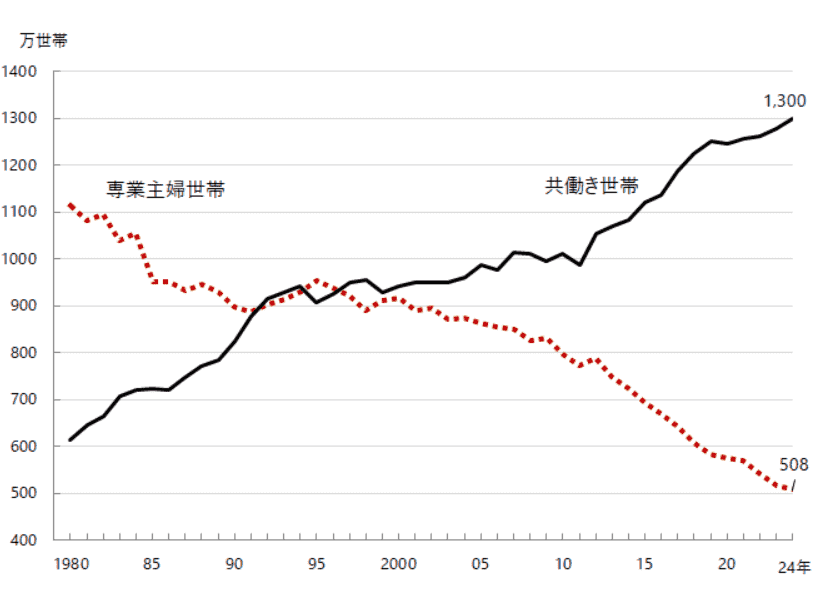 日本では共働き家庭が増加しており、専業主婦世帯と共働き世帯はここ40年で逆転しています。